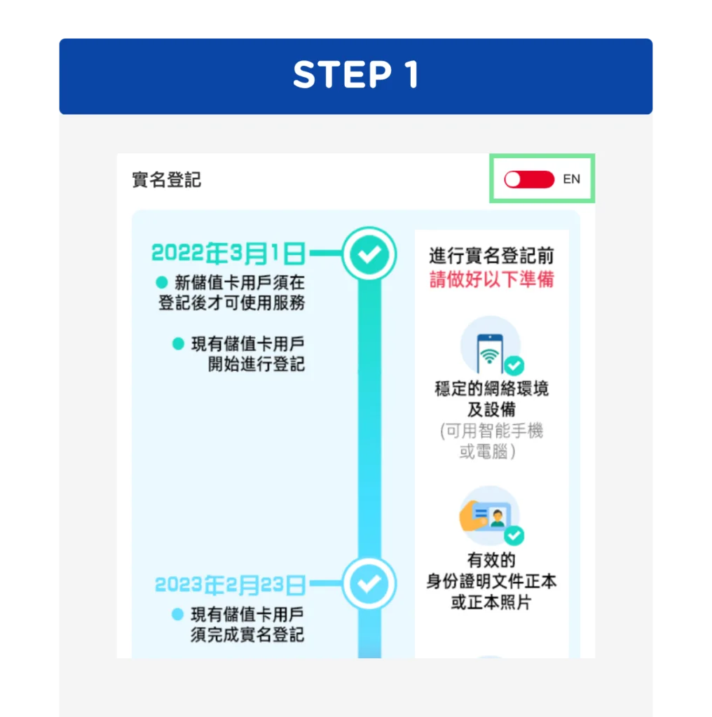 **Step 1: ** Access the following link using the device on which you want to use the eSIM: https://www.cuniq.com/global/HKRealNameRegistration Select the language switch button > EN