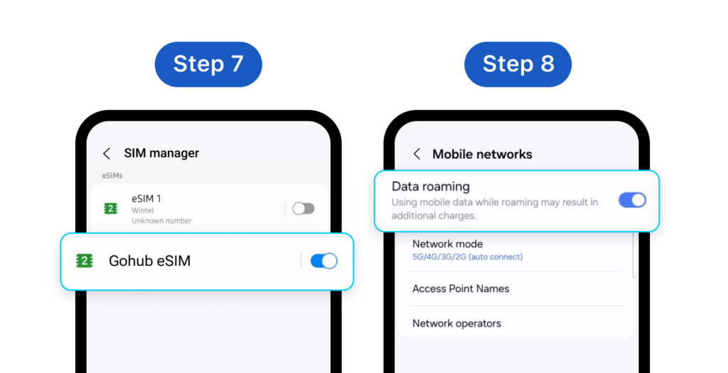 Step 7: Upon arrival at your destination, turn on the eSIM by going to Settings > Connections > SIM manager > Find your newly added eSIM and enable it by toggling the switch on Step 8: Enable Data roaming by going to Settings > Connections > Mobile networks > Switch Data roaming on *Note: Do not enable Data roaming beforehand to prevent early activation of the eSIM. The period of your eSIM validity will start from the moment you activate it on your device