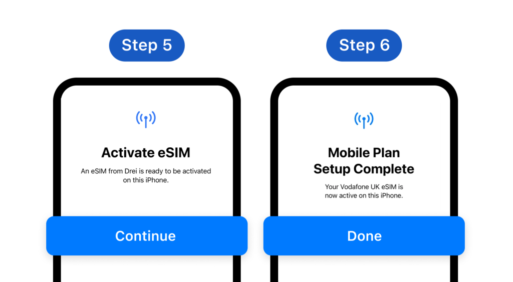 Step 5: Your eSIM is ready to be activated on this device. Tap Continue **Step 6: **Your eSIM is now active on this device. Tap Done to finish