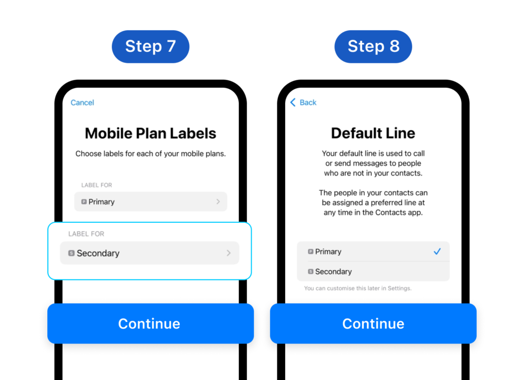 Step 7: In Mobile Plan Labels, you can rename your eSIM to easily manage your data. Then, select Continue **Step 8: **Set your default line to call or send messages. Tap Continue