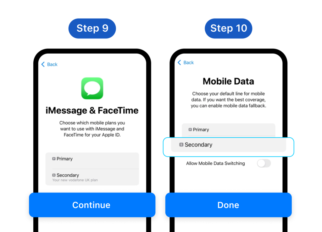 Step 9: Choose the eSIM/SIM you want to use with iMessage and Facetime Step 10: Choose your default line for mobile data. *Note: It's recommended to disable 'Allow Cellular Data Switching' to prevent unintended charges on your primary line.