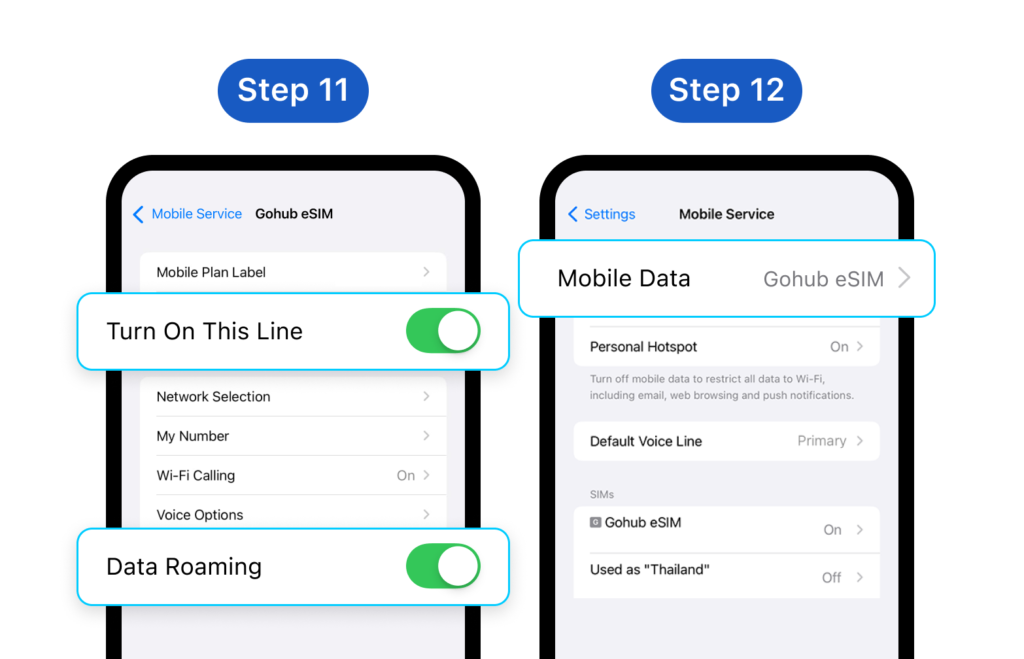 **Step 11: **Upon arrival at your destination, enable Data Roaming by going to Settings > Mobile Service > Choose your newly added eSIM Step 12: Turn on Mobile Data to start using the internet by going to Settings > Mobile Service > Mobile Data *Note: Do not enable Data roaming beforehand to prevent early activation of the eSIM. The period of your eSIM validity will start from the moment you activate it on your device