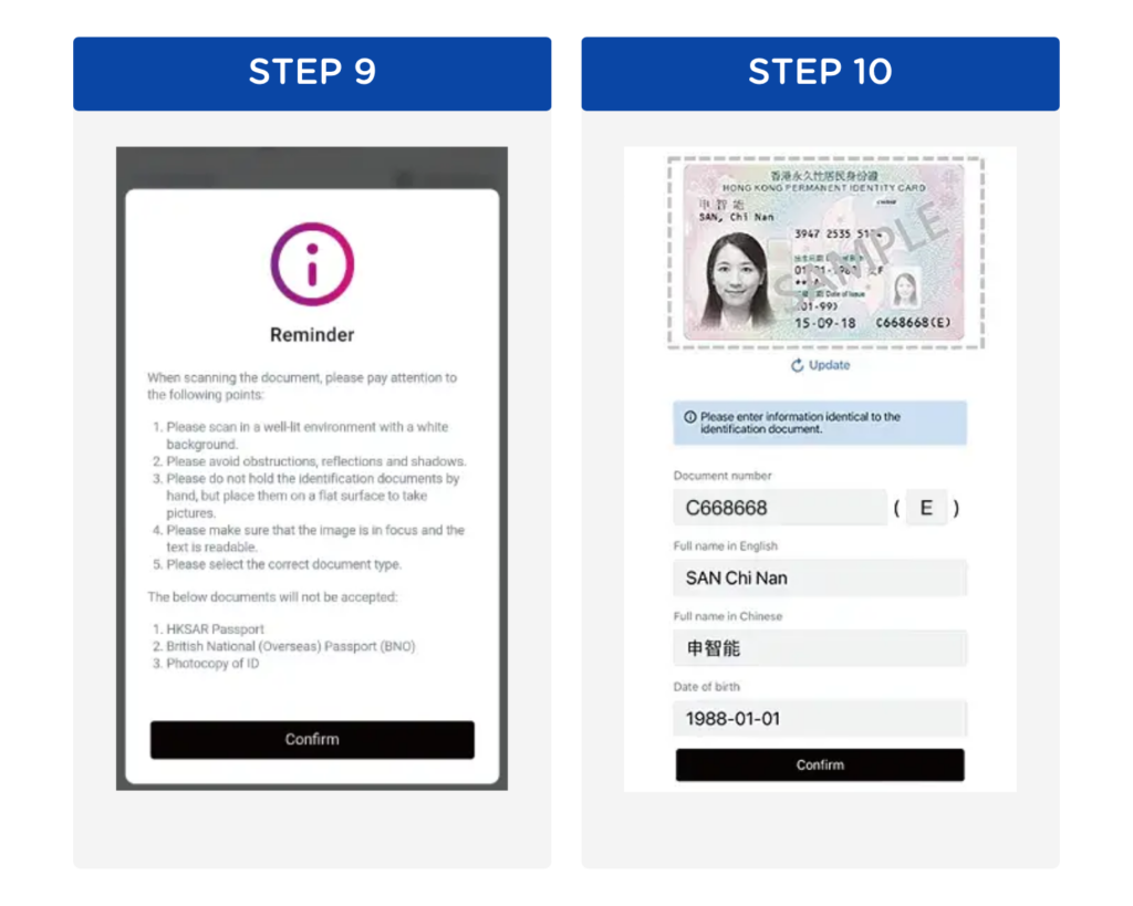 Step 9: Refer to the reminder for scanning ID > "Confirm" to start scanning (Reminder: If autofill information is incorrect, please click "Update" to rescan. All manual changes will be manually assessed, requiring a longer processing time) Step 10: After successful scan, the system will fill in the information automatically