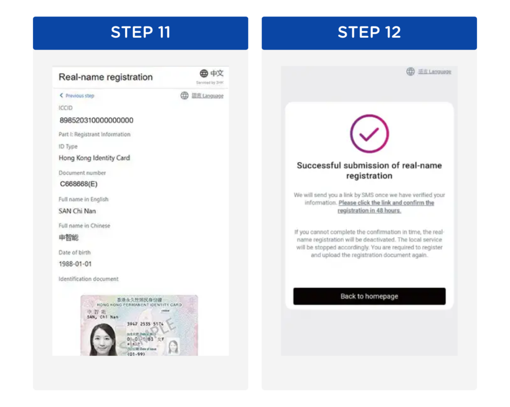 Step 11: Verify your information before submission Step 12: Completed submission of real-name registration. A verification link will be sent via SMS to your prepaid number once your information is verified. Please click the link and confirm your registration in 48 hours