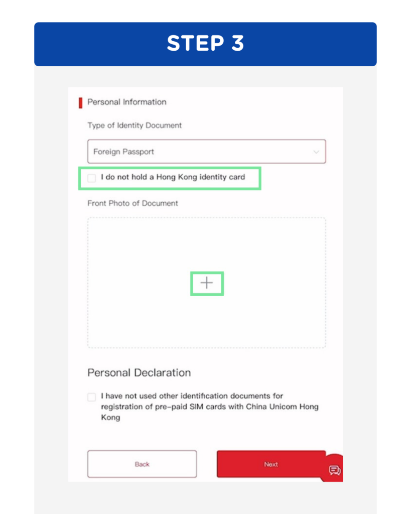 Step 3: In the Personal Information section, select Foreign Passport > Select I do not hold a Hong Kong identity card > Click on the plus icon (+) to take a passport photo.