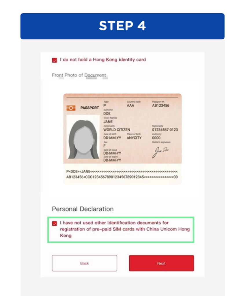Step 4: Take a photo of your passport > Wait about 1 minute for the system to verify the image > After uploading the photo, tick the checkbox in Personal Declaration section > Click Next